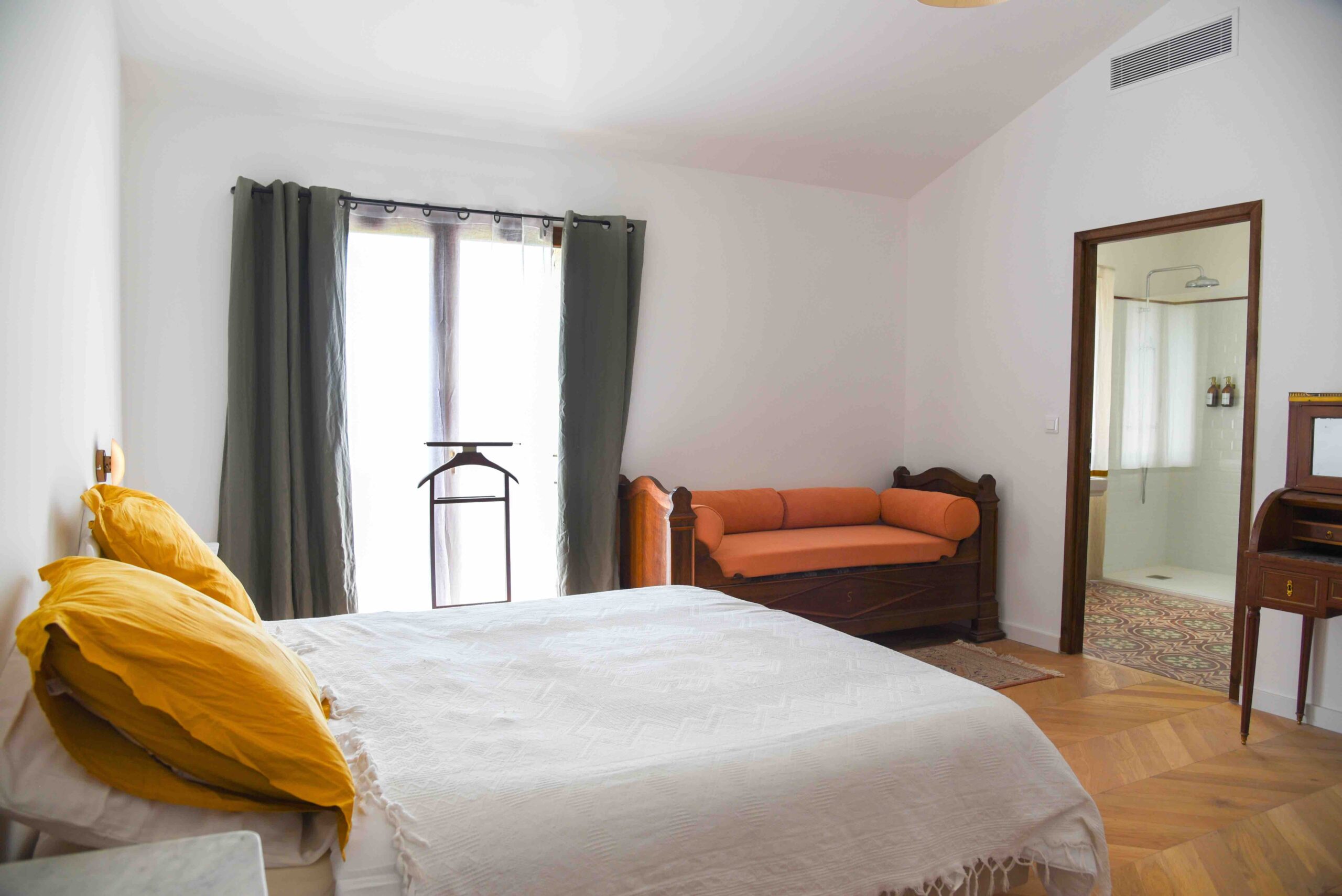 Offrant tout le confort moderne, la chambre est équipée de parquet, la salle de bains de carreaux de ciment anciens.