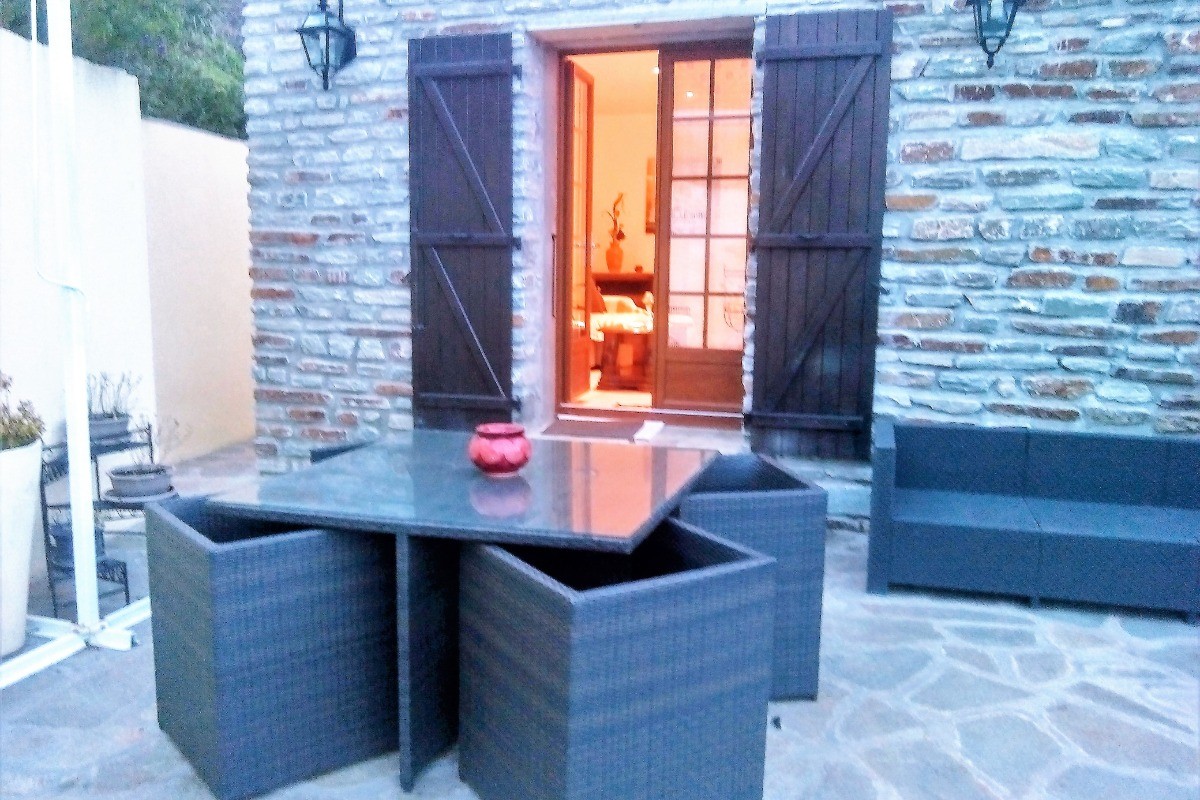 A l'extérieur, une terrasse avec barbecue, table, chaises et salon extérieur donnant sur un jardin privatif.