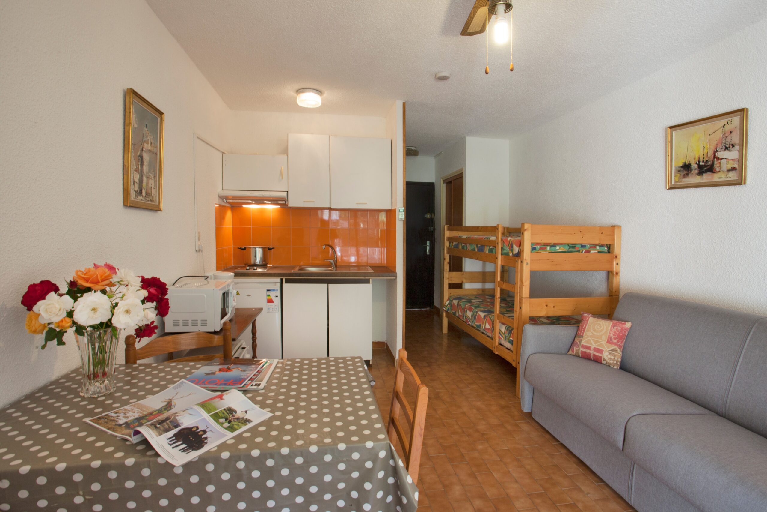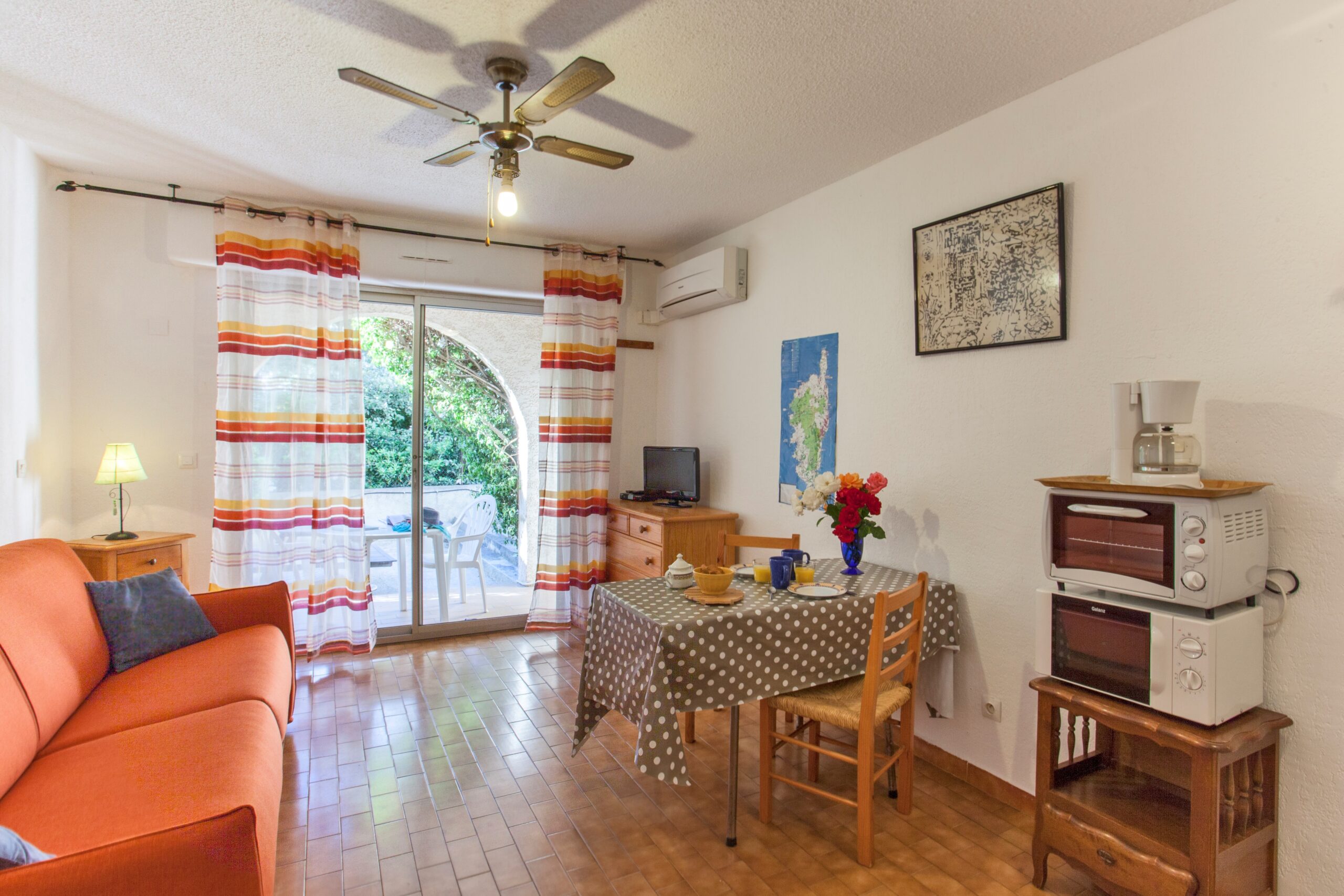 Studio (23 m²) au rdc dans petite résidence « La Roseraie 1 », situé à l'entrée de Calvi, à 100 m de la plage, restaurants et commerces, à 300 m du port de plaisance et 8 km de l'aéroport. Parking privé avec portail sécurisé. Séjour un BZ 160 et 2 lits superposés en 80, TV/SAT/TNT ; salle d'eau avec ventilation, WC, lave-linge, radiateur/ventilateur d'appoint ; coin cuisine avec quatre plaques, frigo-top, mini four et micro-ondes. Climatisation reversible et ventilateur plafond. Loggia-terrasse (4 m²) (au total studio + loggia : 27 m²) avec salon de jardin pour les repas. Wifi gratuit. Animaux acceptés.